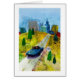 mixed media vacation. Whimsical car driving down the highway to have some fun. Building in the background. 'whimsical painting', 'whimsical art', 'whimsical paintings', spontaneously, fanciful, playful, quaint, 'whimsical items', whimsy, 'whimsical flowers', art, contemporary,' wall art', paintings, sloane, sloane whimsical, house, 'whimsical house'