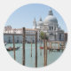 Round sticker of gondolas and gondoliers on the water of the Canal Grande with the Santa Maria della Salute church in the background creating a romantic city landscape during the summer holidays in Venice, Italy.