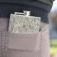 The flask itself is fine. It’s a cheap flask, obviously bought in bulk, however am prepared to overlook that. Given that it is a personalized item, I would have liked to have seen gift boxing instead of the generic packaging. Terrible printing, and/or quality. It’s a cheap, tacky vinyl. It is not cut straight and is also applied in a way that it is overhanging the bottom, causing the glue to catch on items and it will eventually roll and tear, damaging the wrap.