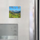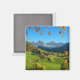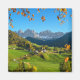 Magnet with the village of St. Magdalena or Santa Maddalena with the characteristic church in front of the Geisler or Odle Dolomites mountain peaks in the Val di Funes valley (Villnoesstal) in Italy in autumn surrounded by autumn leaves.