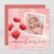 Share with family and friends the happy news of the birth of your Valentine baby with this announcement card adorned with your favourite Instagram photo. Beautiful hearts and twinkling fairy lights bead curtain background in light peach and blush pink, decorated with a bunch of heart-shaped balloons in red and various shades of vintage pink. Replace the sample photo and text with your own for a personalised gift. Simple, modern, versatile design with stripes background at the back.