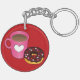 Illustration of a chocolate frosted doughnut topped with heart sprinkles and served with a mug of coffee in a pink mug with a heart.