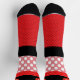 These socks are whimsical and fun. Perfect for Valentine's Day or any day. The top is black with a red heart, that reads "Be My Valentine “. Next there's a white criss cross pattern. In the mid section it's pink with white polka dots and, on the bottom, red with black dots.