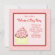 These Valentine themed invitations have a chocolate cupcake, with fluffy pink frosting, and red heart sprinkles, have a pink, heart patterned background on the border, and light pink polka dots in the centre.