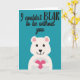 This cute Valentine's greeting card features a lovely cartoon white bear holding a pink heart on a light blue background with a fun word pun caption that reads "I couldn't BEAR to be without you".