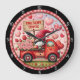 This colorful circular wall clock features a whimsical Valentine's Day illustration of a gnome driving a small red pickup truck. The gnome, wearing a tall red hat, is seated in the truck bed next to a large bouquet of pink roses and red tulips. A wooden sign in the truck bed reads "SWEETHEART EXPRESS," and the truck side has the words "HUGS & KISSES". The background is a soft pink and blue sky filled with floating red and plaid hearts. The clock face is framed by a black ring and a distinctive red and white gingham border.