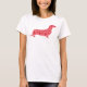 Dachshund silhouette filled with tiny red hearts on a pink background and outlined in white. This t-shirt is a great Valentine's Day gift for that someone who loves this hound dog breed.