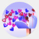Stickers with my original digital artwork of pink, red and purple hearts floating out of a rural mailbox.