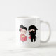 Adorable little ninja dressed in black is blushing shyly while holding an origami paper heart behind his back and looking at a cute geisha girl in red kimono dress and yellow obi sash.
