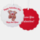 Sweet picture of two squirrels holding a heart together and kissing, is featured on this Valentine's Day paper ornament greeting card. Front of ornament card reads, "Happy Valentine's Day, Hugs And Kisses". Back of ornament card has a red background with white letters and reads, " I Love You Valentine"! A cute card to give that special person in your life, that can hang as an ornament for Valentine's Day!