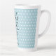 Celebrate love and friendhip with this Valentine's day latte mug, featuring the text 'Whole Latte Love' in black script on a pastel blue background adorned with a pretty little hearts pattern. Personalise this heartfelt gift with your name! Exclusively designed for you by Happy Dolphin Studio.
