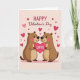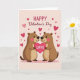 This greeting card shows two cute brown groundhog-like animals standing face to face in the center. They have round bodies, small paws, gentle smiles, and pink blush on their cheeks, which makes them look sweet and caring. Between them, they hold a shiny pink heart with the word “LOVE” written in white block letters. Near the top of the card, the text reads “HAPPY Valentine’s Day,” with “HAPPY” in simple sans-serif letters and “Valentine’s Day” in a flowing script style. The background is a soft blush color, with many small pink hearts floating around in different shades. The whole scene feels warm, calm, and full of affection, like a quiet moment shared between friends or partners