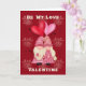 The design has a red background with hearts and cupids, two balloon hearts, and two Gnomes in love. The words on the inside can be changed.