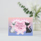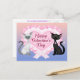 Valentine's Day Cats postcard features a pink and violet gradient background, with a white and grey cat wearing a pink heart on it's collar, a black cat with a white tip on it's tail, wearing a pink heart on it's collar. The cats are sitting in front of a pink heart with white lace and a white and pink bow. Stylised dark dark pink text is Happy Valentine's Day! Perfect for Valentine's Day mailings. Matches our Address labels and Postage.