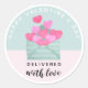 Valentine's day sticker with cute envelope and hearts illustration, and text "Delivered with love". Pastel mint and pink colour.