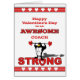 Cute Valentine's Day greeting card for a coach. A muscular penguin is lifting heart weights and a shadow is cast behind it. Happy Valentine's Day to an Awesome Coach, text on the cover. Penguin element thanks to HGomez/Openclipart. Art, image, and verse copyright © Shoaff Ballanger Studios.