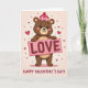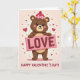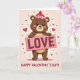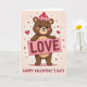 This greeting card features a cute brown cartoon bear standing front and center, surrounded by small red hearts on a soft pink background. The bear has big shiny eyes with little lashes, rosy cheeks, and a gentle smile that feels sweet and friendly. It’s wearing a pink knitted beanie with a fluffy pom-pom and a lighter pink bow on the side. In its paws, the bear holds a bright pink rectangular sign that says “LOVE” in dark reddish-brown block letters, slightly tilted for a fun touch. Near the bottom of the card, the message “HAPPY VALENTINE’S DAY!” appears in clear, easy-to-read lettering. The soft colors and floating hearts give the whole scene a warm, caring feel that fits romance or close friendship ❤️💌🍫. Hope this helps you share kind Valentine’s Day feelings with someone you care about.