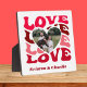 Home decor for Valentine's Day. Celebrate love with this square plaque with an easel, personalised with your names or initials and your favourite couple photo on a heart design with red text.
