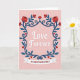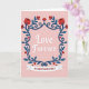 This Valentine’s Day card is set on a soft pale pink background that creates a warm, romantic mood. At the center, the words “Love Forever” appear in flowing white cursive, gently raised to stand out as the heart of the message. Surrounding the lettering is an elegant floral frame made of deep blue vines woven with bright red flowers. The blooms feature layered petals, while the curling vines add graceful movement. Small red heart shapes are tucked among the flowers, reinforcing the theme of lasting affection. Along the bottom, a white ribbon banner displays “VALENTINE’S DAY” in bold red letters. The blend of soft pink, rich blue, and vivid red creates a timeless card perfect for sharing enduring love. ❤️💌🍫