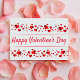 The central focus of the card is the bold, red script "Happy Valentine's Day" that sits prominently against a crisp white background, flanked above and below by horizontal bands of hearts. This classic yet dynamic design captures the essence of Valentine's Day - a time to spread love and happiness to those we hold dear.