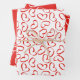 Valentine's Day holiday graphic art with one red heart repeated randomly at different rotations to create a random open heart pattern. The set of three includes; one sheet with red hearts on a white background, one sheet with white hearts on a red background, and one sheet that is solid red. These are fun for gift wrapping, party decorations, and crafts.