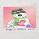 Valentine's Day Snowman postcard features a pink snow scene background, with a Happy Snowman wearing a top hat with a green and white polka dot ribbon, holly and a matching scarf. The snowman is holding 3 hearts, a pink decorated heart, a white heart with True Love text, purple heart with Love You text. Stylised pink text is Happy Valentine's Day! Perfect for Valentine's Day mailings.