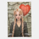 3D digital render of a beautiful teenager girl in a retro dress holding a balloon in a heart form on a stone wall background. Perfect Valentine's Day gift