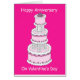 A multi tiered wedding cake decorated with pink and white icing, against a bright pink background. The words 'Happy Anniversary on Valentine's Day' in white text accompany the image.
