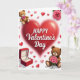 This card features a glowing red heart centered on a bright white background, setting a sweet Valentine’s mood ❤️. Across the heart, the words “HAPPY Valentine’s Day” sit neatly in the middle in a graceful, flowing style, standing out clearly against the red. A teddy bear peeks in from the top-left corner as if shyly joining in, while another teddy bear rests at the bottom-right, holding a small bouquet of pink roses close to its chest 🥰. In the top-right, a single pink rose opens wide with green leaves that add a soft, natural contrast. At the bottom-left, an open red velvet ring box reveals a gold band topped with a sparkling diamond, catching the light like a quiet promise. Small ruby-red and candy-pink hearts drift across the background, giving the scene a light, floating feel. The bears look plush and cuddly, the heart looks glossy, and the ring and diamond glint with tiny highlights against the white space. A gentle, diffused glow surrounds the central heart, while the scattered hearts appear in different sizes across the page.