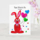 Funny and cute red bunny stepping out to wish a child Happy Valentine's Day. He's holding on to heart balloons in an assortment of colors.