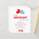 Valentine's boy baby shower invitation with A little sweetheart is on the way typography script featuring two hearts and a red bow.