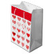 Paper gift bag is shown in red and white with a Valentine's hearts print.