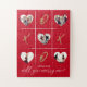 Pop the question on valentine's day with our fun and trendy, will you marry me? custom 5 photo layout jigsaw puzzle. Our design features a fun tic tac toe design with heart shapes for you to add your own images. "Will you marry me?" is designed in a trendy black typographic design. Customised with the recipient's name for a truly fun and unique valentine marriage proposal.