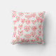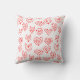 This throw pillow has a mid-century modern Valentine’s design of scattered red heart mazes on a field of white.
