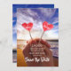 Personalise twin flame save the date with cute heart shaped. Lolipops against a beautiful beach scene with the words "I Asked" and "I Said Yes"