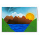 Sunset valley illustration scene with mountains and a lake. Available on various gifts and products.