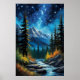 Gaze upon a celestial masterpiece in this captivating scene. A valley cradles nature's wonder as a resplendent starry sky unfurls above. Towering snowy peaks frame the enchantment while a crystal stream dances through rocky terrain. A symphony of elements woven into a timeless canvas.