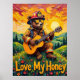 This delightful painting portrays a bear dressed as a firefighter, wearing sunglasses and a helmet, strumming an acoustic guitar while sitting on a grassy knoll overlooking a picturesque valley under a warm, colourful sunset. Amongst the wildflowers. The thick, textured brushstrokes enhance the whimsical and sweet nature of the scene, with "Love My Honey" prominently displayed.