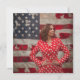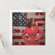 The image depicts a confident woman standing. a Kamala Harris look-a-like in front of a large American flag. She is dressed in a striking red polka dot blazer, which adds a vibrant and stylish touch to her appearance. Her hands are placed on her hips, and she gazes off to the side with a composed and determined expression. The flag in the background, with its stars and stripes, provides a patriotic backdrop, emphasizing themes of national pride and leadership. The overall composition of the image conveys strength, confidence, and a sense of purpose.