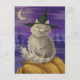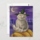 Graphic design of a fluffy cat wearing a witches pointed hat and showing vampire fangs.