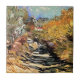 Oil on canvas from 1889 shows a single woman walking towards a house at the end of a small road in Saint Remy, France, with plants and trees on either side in deep autumn colours against a blue and green sky.