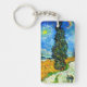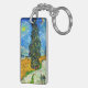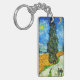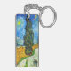 Keychain featuring Vincent van Gogh’s oil painting Road with Cypress and Star (1890), also known as Country Road in Provence by Night. People walk along a road passing a beautiful cypress tree underneath a blue night sky with yellow moon and stars. A fantastic gift for fans of Post-Impressionism and Dutch art.