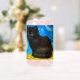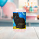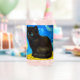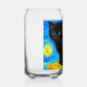 Can Glass featuring a Van Gogh cat in the style of Starry Night! A fluffy black kitten perches on a table against a blue night sky and yellow moon. A purr-fect gift for cat lovers and Dutch art collectors!
