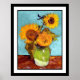 Vincent Van Gogh's Three Sunflowers In A Vase. Oil on canvas from 1888 showing bright yellow sunflowers in a green vase against a turquise blue background. Keywords: Flowers, Still Life, Florist, Painting