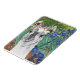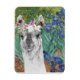 Beautiful and artistic digital compilation features Vincent Van Gogh's Irises fine art painting as a backdrop to an adorable watercolor llama with a fancy crown of flowers.