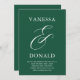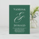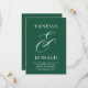 Modern wedding save the date card featuring a simple and minimal layout with your names and an elegant ampersand in a large format above your event details. The colour theme is emerald green and may be changed in the design editing tool.