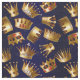 Various gold crowns with gems on blue & black embellished background, seamless repeat pattern