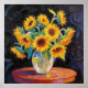 Bright yellow sunflowers bloom energetically in a clear vase. They sit on a wooden table with a swirling dark background, enhancing their vivid colors.