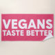 This graphic features bold, pink typography stating “VEGANS TASTE BETTER” prominently. The design employs a modern, eye-catching font that emphasizes the positive message about veganism. The bright colour scheme and strong text create an engaging visual, appealing to those who appreciate or promote plant-based lifestyles. This piece can serve as a slogan for a vegan campaign, restaurant, or awareness initiative