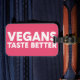 This graphic features bold, pink typography stating “VEGANS TASTE BETTER” prominently. The design employs a modern, eye-catching font that emphasizes the positive message about veganism. The bright colour scheme and strong text create an engaging visual, appealing to those who appreciate or promote plant-based lifestyles. This piece can serve as a slogan for a vegan campaign, restaurant, or awareness initiative